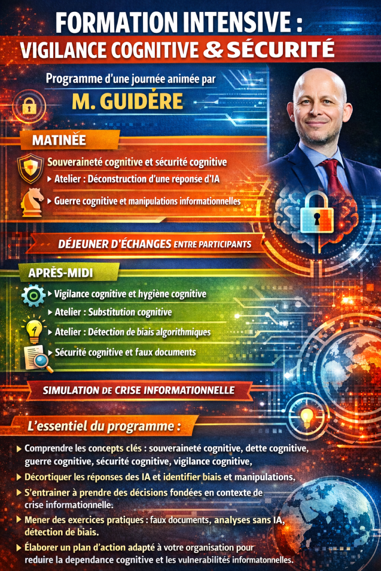 Nous réalisons des expertises et des formations en vigilance cognitive : souveraineté cognitive, dépendance cognitive, dette cognitive, entropie cognitive, radicalisation cognitive, etc.